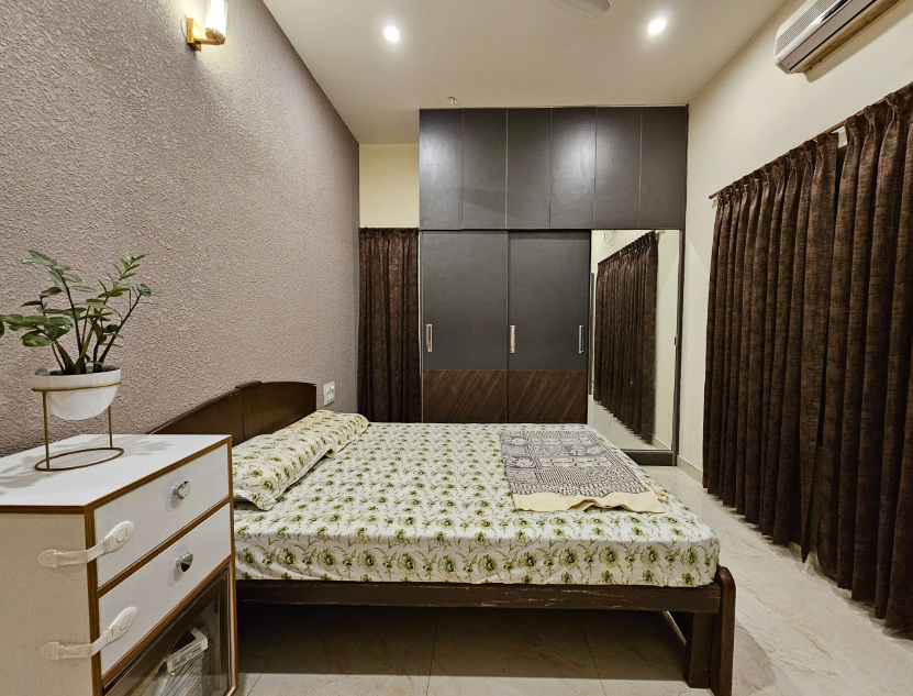 ,Buildup area – 4100sqft,Plot area – 1200 sqft,Fully furnished ,Lift available – 4 person capacity, Solar panels and it’s backup,Harvell interiors ,Terrace sit out area,2 balcony and 1 utility,4 BHK Duplex House and 5 bathrooms,TEAKWOOD doors (main &pooja),Jaguar thermostat fittings,Gm switches,Biometric Access, CCTV Available,3 cots, geaser.
